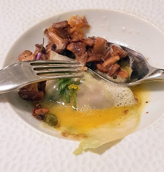 Pablo arrive et le sommelier ouvre ses deux vins. Nous bâtissons le menu, qui sera : tourteau de Roscoff en gelée de homard, crème de fenouil et corail à l’estragon / girolles juste saisies lasagne et jaune d’œuf à peine coulant relevé d’une écume poulette Yuzu et craquelin / volaille Culoiselle rôtie à l’ail noir sous la peau, celtuces et bimis, fleurette d’herbes fortes et thé matcha / noix de ris de veau doré au basilic, tétragone et girolles en salade, poivrade sautée.