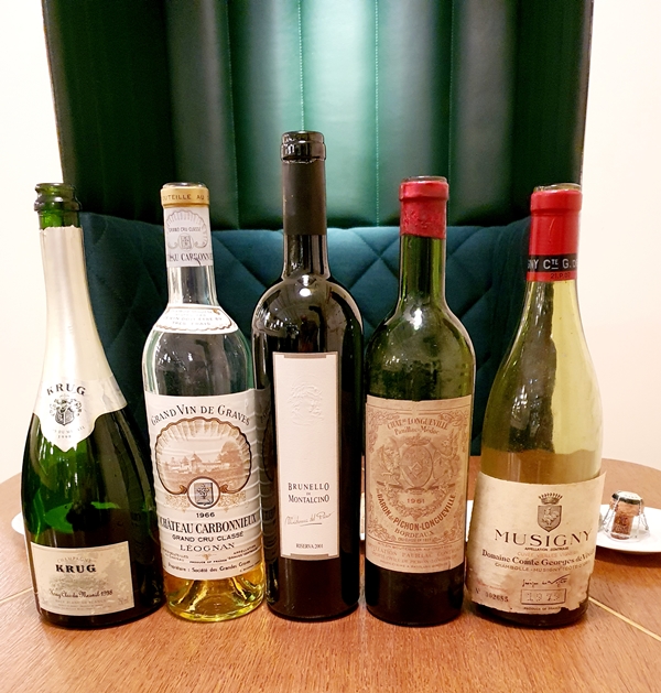 Mon vote est : 1 – Musigny de Vogüé 1979, 2 – Pichon Baron 1961, 3 – Carbonnieux blanc 1966, 4 – Brunello di Montalcino 2001, 5 – Krug Clos du Mesnil 1998.