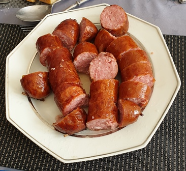 L’ami Pierre qui nous reçoit a prévu des langoustines à la mangue, des saucisses de Morteau avec une fricassée de champignons et des fromages. Sur mes suggestions il a ajouté un Stilton et des mangues pour la fin du repas.
