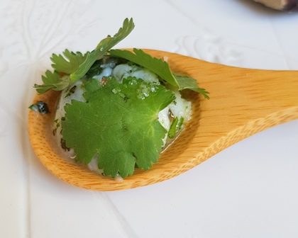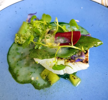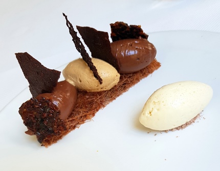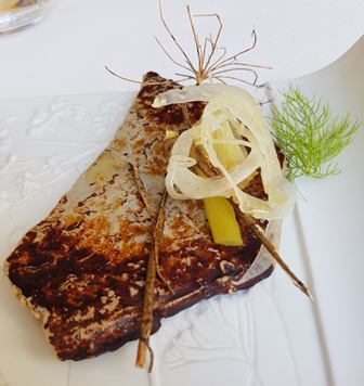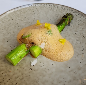 Après le beau dîner d’hier je suis à l’eau ce qui ne m’empêche pas de déguster le très intéressant menu composé de : trois amuse-bouches : céviche de lieu jaune et coriandre / fenouil au pastis fumé aux branches de fenouil / mini aubergine frite. Menu : asperge verte de Sylvain Erhardt (Alpilles), tourteau et fèves, bisque de tourteau / merlan, épinard et pissenlit, citron confit à l’ail des ours et oseille / veau du Perche, asperges blanches de Tours grillées et crues, maïtaké grillé sur le bincho / chocolat aux fèves de Tonka, mousse au café et glace au foin / riz au lait, rhubarbe et fraises.