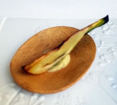 Le chef Ryuji Teshima dit Teshi fait une cuisine toute en élégance. Les amuse-bouche sont des suggestions de pistes gustatives. L’asperge est croquante à souhait. J’aurais aimé une bisque plus virile et épicée sur le tourteau mais la combinaison tourteau et asperge est agréable. Le merlan est le plat le plus gratifiant de ce repas, parfaitement cuit et de belle mâche. Le veau réagit bien aux asperges à croquer, plus qu’aux lamelles de peau d’asperge qui réduisent la longueur de son goût. Le champignon japonais est très goûteux. Cette cuisine élégante et légère – à part le dessert au chocolat – me plait beaucoup. Je reviendrai bientôt et il y aura du vin !