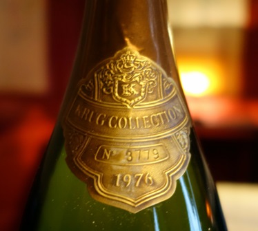 A l’apéritif, sur de délicieuses gougères, nous buvons un Champagne Krug Collection 1976 à la couleur d’un ambre léger. Le nez est superbe de générosité et d’ouverture. En bouche c’est un vin de soleil, dont la bulle est faible mais cela ne gêne pas. Il a déjà une belle évolution qui le porte vers une sereine maturité. C’est un grand champagne surtout par sa complexité. L’acidité est belle. Les fruits sont jaunes avec un citron apaisé. Tomo qui l’a apporté me demande si le vin est sans défaut. Nous tombons d’accord sur le fait qu’il ne s’agit pas d’une bouteille parfaite car ce 1976 pourrait être plus grand encore, mais il a beaucoup de charme et de personnalité. Il lui manque juste un peu de rayonnement. Cette remarque est à la marge. L’amuse-bouche, un tarama de langoustine aux œufs de hareng fumé est délicieux et fait vibrer le champagne.