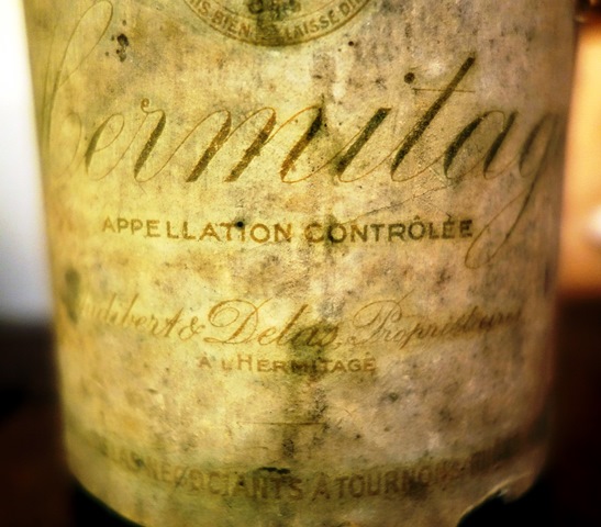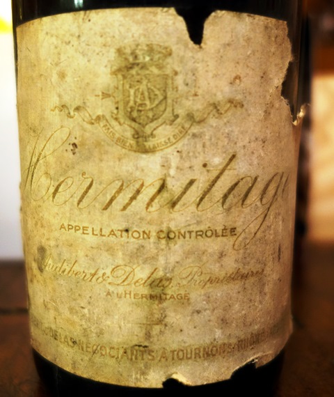 Deux jours après, c’est le dernier dîner parisien de mon fils qui repartira à l’aube aux Amériques. La veille mon fils avait visité ma cave et au détour d’une allée j’avais remarqué une bouteille. Je lui avais dit : « Est-ce que ça te tente ? ». Rapportée hier je l’ai ouverte ce soir à 19 heures c’est-à-dire un peu tard. Il s’agit d’un Hermitage Audibert et Delas 1945. Le niveau est à environ 5 centimètres du bouchon. L’opération de débouchage ne pose aucun problème particulier. Le nez du vin m’annonce de bien mauvaises nouvelles. Je ne crois pas à un retour à la vie, surtout en un temps si court.