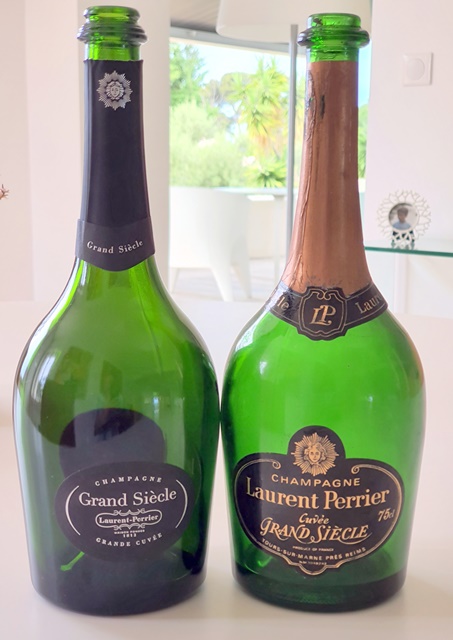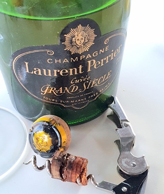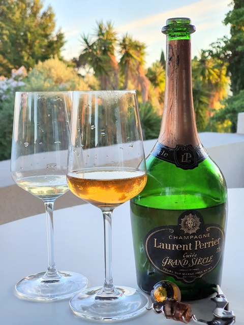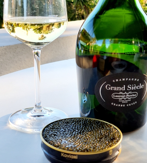 Ça y est, c’est le jour du départ dans le sud. Là-bas, tout n’est qu’ordre et beauté, luxe, calme et volupté, dirait Baudelaire. Le premier soir, j’ai envie de manger du caviar avec deux champagnes, un jeune et un vieux de la même maison, pour vérifier une fois de plus si mon amour pour les champagnes anciens est justifié. J’ouvre un Champagne Laurent-Perrier Grand Siècle très récent dont le fort pschitt et le bouchon qui se gonfle dès qu’il est retiré montre sa jeunesse.