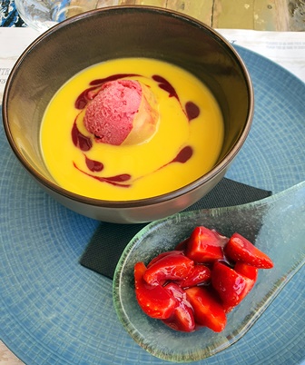 Nous commençons par des fraises fraîches qui sont délicieuses sur la fraîcheur du jeune champagne. Une poutargue bien moelleuse et délicieuse se conçoit bien avec le jeune mais l’ampleur du champagne ancien, à la couleur ambrée et au charme infini trouve un écho supérieur avec le gras de la poutargue.