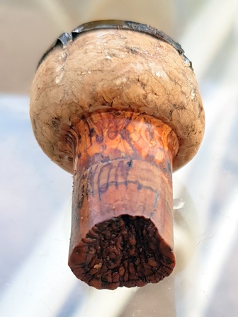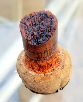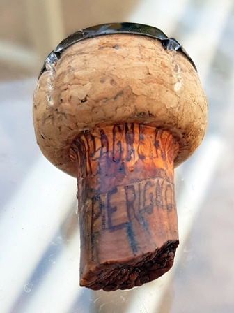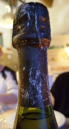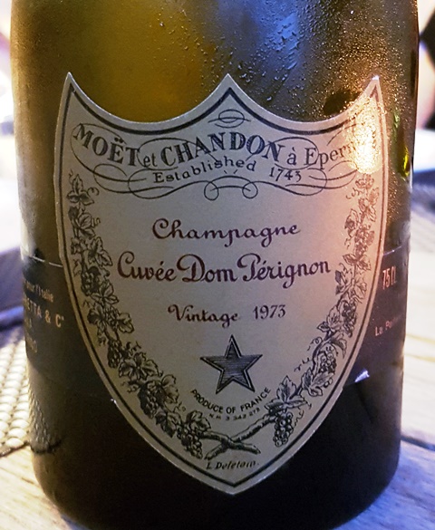 Quel champagne pourrait suivre celui-ci ? J’avais une petite idée mais au détour d’une conversation j’apprends que Sarah est de 1973. L’occasion est trop belle de faire suivre le 1982 par un Champagne Dom Pérignon 1973. Je dis à Sarah : « je parie que le bouchon se brisera en deux ». Il se trouve que les deux fois récentes où j’ai ouvert ce 1973, le bouchon s’est cassé. Malgré toutes mes précautions et mes gestes lents, le bouchon de celui-ci se brise aussi montrant que la tranche de liège qui est juste au-dessus de la tranche inférieure qui est au contact du vin, est d’un liège manquant de consistance, qui s’est chaque fois cisaillé. Et pourtant le haut du bouchon m’avait donné bon espoir. Je lève avec mon tirebouchon le reste du bouchon et le pschitt est extrêmement net, puissant. Je verse le champagne et oh surprise, il est beaucoup plus clair que le 1982. Son nez très pur est semblable à celui du 1982. Froid, il fait plus jeune que le 1982.