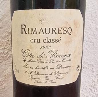 L’autre vin que j’ai apporté est un Rimauresq Côtes de Provence rouge 1993. Le niveau est absolument parfait. L’odeur est merveilleuse au moment de l’ouverture 5 heures avant. On sent avec force l’olivier et la garrigue. Lorsque je le sers, le parfum est d’une rare insistance. Le vin est riche, dense et présente le summum de ce qu’un Côtes de Provence peut offrir. L’âge donne beaucoup à ce vin. Je n’arrive pas à croire qu’il fasse 12,5 degrés. 14 serait plus adapté. Le vin est noble, élégant. Il serait difficile à l’aveugle de dire Côtes de Provence. Nous l’avons bu avec un poisson Saint-Pierre et l’accord est parfait. Comme pour le Krug Grande Cuvée, je dirais aux amateurs : laissez vieillir les Côtes de Provence et Bandol, la différence est phénoménale.