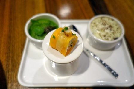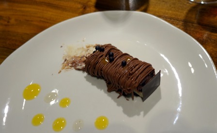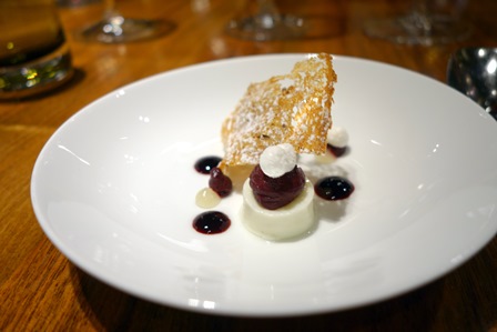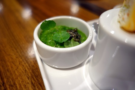 Le menu que nous ne connaissons pas à l’avance, conçu par Jean Sulpice avec le sommelier Alex et peut-être, dans l’ombre et à distance, avec Jean-Philippe Durand (qui sait ?) est : galette de sarrasin / amuse-bouche : langoustine litchi – joue de bœuf – caviar d’Aurenki, cresson / écrevisses, cèpes, noix de Grenoble / variation de légumes, sarriette / huître Papin-Poget, topinambour, foie gras / Plin, escargots, herbes / boudin à la truffe, réglisse / truffe noire en croûte ris de veau / chevreuil, gentiane, betterave / myrtilles, absinthe / crémeux chocolat, livèche, citron / chocolat, passion, jasmin / chartreuse, chocolat, mûre.
