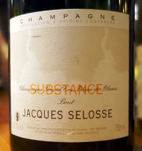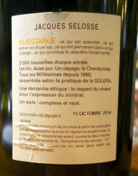 Le Champagne Jacques Selosse Substance dégorgé en octobre 2014 est au sommet de son art, vif, cinglant et riche à la fois. Un ami dit que c’est pour lui la définition du champagne. Je ne suis pas d’accord car c’est un champagne qui explore des saveurs hors des sentiers battus. Il y a des fruits roses, des tisanes et le champagne se montre extrêmement gastronomique. Il crée sur les légumes un accord idéal.