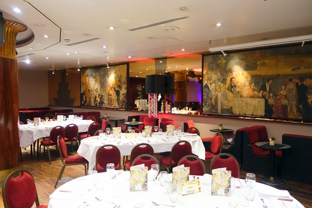 Dîner à La Coupole. Il flotte encore dans l’air l’esprit littéraire d’il y a plus d’un demi-siècle. Au sous-sol, la salle où l’on dansait jadis évoque Joséphine Baker, bambous et bamboulas. La décoration exotique et zazou est plaisante. Le dîner est caritatif pour la fondation pour la recherche sur l’épilepsie. Le menu pour une centaine de personnes est de bonne qualité : foie gras de canard, chutney de fruits de saison / paleron de bœuf longuement cuisiné façon Rossini, gratin de pommes de terre et céleri / velouté de fruits exotiques, sorbet au fromage blanc. C’est joliment exécuté. Le parfum du vin rouge ne m’incite pas à le goûter, mon esprit est ailleurs.
