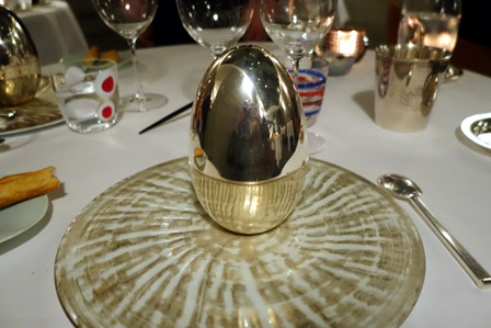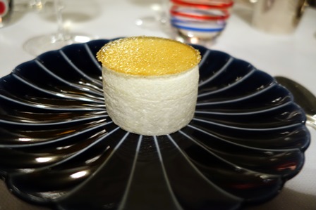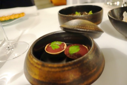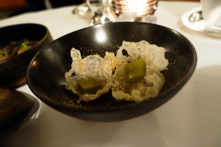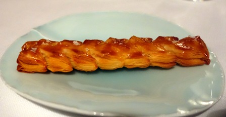 Nous avons commencé par trois amuse-bouche qui sont une introduction sur le talent du chef. J’ai voulu qu’on m’imprime le menu, ce qui fut fait et qu’on indique les trois amuse-bouche mais on m’a refusé au prétexte curieux que ça change tous les jours. Si on a été capable de les présenter au moment du service on devrait pouvoir en restituer la mémoire. D’autant qu’ils sont fort bons. Pour eux, nous prenons chacun un verre de Champagne Dom Pérignon 2006 que je trouve dans un état de grâce absolue. Il a un nez de pierre à fusil et combine minéralité et romantisme. C’est vraiment un beau Dom Pérignon.