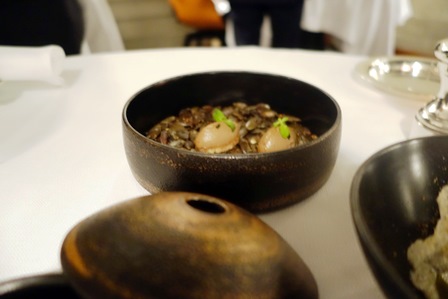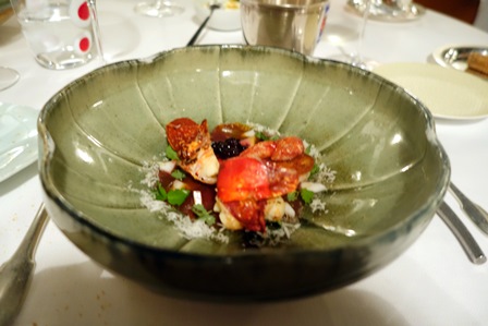Ensuite et c’est une mode actuelle, chaque plat a une vaisselle qui lui correspond. Il y a une recherche visuelle certaine comme pour le homard, mais les créateurs d’assiettes oublient que l’on doit aussi poser ses couverts et comme il n’y a pas de porte-couteaux, les couverts se brinqueballent dans l’assiette, au risque de s’y salir. Ce détail n’est pas propre à ce restaurant. C’est une tendance.