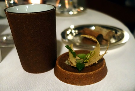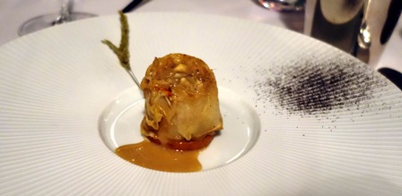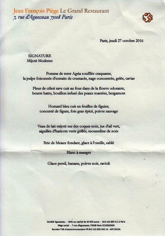 La cuisine de Jean François Piège m’apparaît comme fondée sur une précision et une justesse totale des goûts. C’est une cuisine de goûts affirmés. Je pense qu’il y a peu de chefs qui ont cette affirmation des goûts. Ça n’empêche pas de créer des surprises et le brie fondant avec une glace à l’oseille, c’est particulièrement osé, mais j’adore cette provocation gustative. Ce chef est un grand chef et c’est sur les détails que les choses vont moins bien. Les trois amuse-bouche se prennent à la main. Comme le premier est poudré d’une poudre de couleur bordeaux, on en a sur les doigts, on s’essuie sur la serviette et la serviette devient poudrée. On se pose la question de la changer ou non.