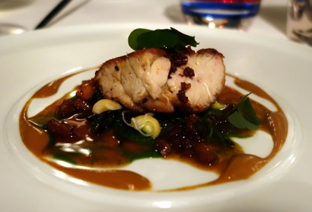 Je savais que Bipin m’entraîne toujours vers des vins chers et il ne va pas manquer à sa tradition. J’ai choisi le vin du Rhône et lui le vin de Bourgogne. Nous prenons le menu dégustation à quatre plats dont les intitulés sont : pomme de terre Agria soufflée craquante, la pulpe foisonnée d’extraits de crustacés, nage concentrée, gelée, caviar / fleur de déleri rave cuit au four dans de la flouve odorante, beurre battu, bouillon infusé des peaux toastées, bergamote / homard bleu cuit en feuilles de figuier, concentré de figues, foie gras épicé, poivre sauvage / veau de lait mijoté sur des coques de noix, jus d’ail vert, aiguilles d’haricots verts grillés, mousseline de noix / brie de Meaux fondant, glace à l’oseille, sablé / blanc à manger / glace persil, banane, poivre noir, ravioli.