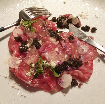 Le wagyu mariné dans une soupe est servi froid alors qu’il pourrait aussi être servi chaud, comme l’explique le chef du Pilgrim. L’accord avec le caviar est d’un grand naturel et c’est pertinent pour l’accord que le wagyu soit froid.