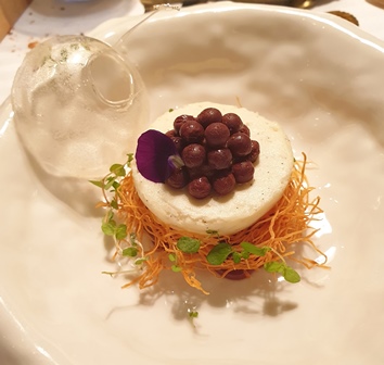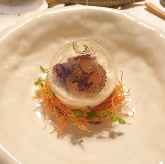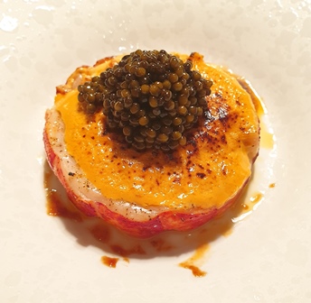 J’ai été très impressionné par le troisième plat car je n’aurais jamais parié sur un accord entre homard et oursin, car mon intuition est qu’ils ne peuvent pas s’entendre. Or la crème d’oursin très douce et le homard à peine cuit, donc divinement cuit, se sont entendus à merveille. Le caviar Kristal apporte une petite note salée sans prendre le devant de la scène laissé à ce merveilleux accord homard et oursin.
