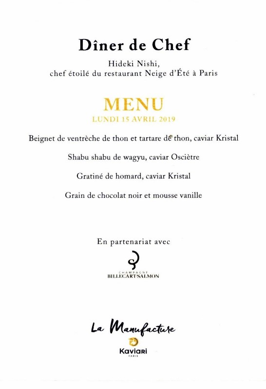 J’arrive à la Manufacture Kaviari. Le sujet de conversation est celui de l’effroi que cause le terrible incendie de la cathédrale. Nous serons douze à table pour profiter de la cuisine de Hideki Nishi, le chef du restaurant Neige d’Eté. Le chef est venu avec toute son équipe et aussi avec le chef du restaurant Pilgrim dont il est aussi propriétaire.