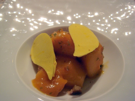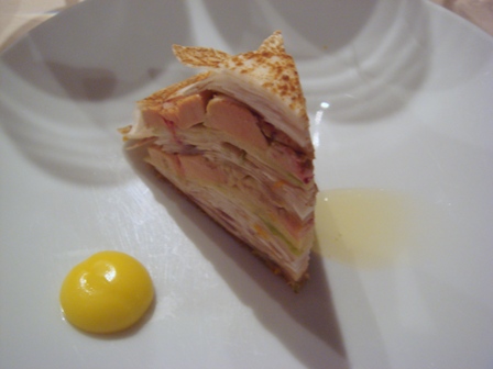 Foie gras mariné au verjus, galette de champignons de Paris, pâte de citron confit
