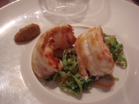 Langoustine dorée, chou cuisiné à la cacahuète et Rouget, oignon rouge et poireau