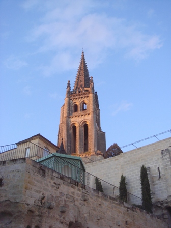 L’église de Saint-Emilion parée du rose d’un soleil couchant (vue d’un jardin suspendu proche de ma chambre à l’hostellerie de Plaisance).