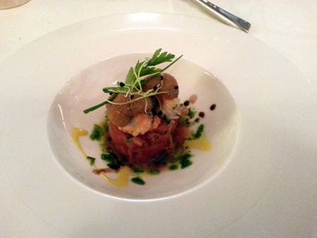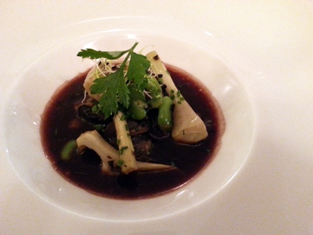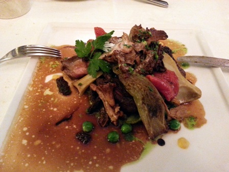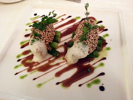La carte des vins est superbe, avec quelques belles pioches. J’en repère une de première grandeur : Musigny Vieilles Vignes Domaine Comte Georges de Vogüé 1989. Pour l’accompagner, ma commande est : escalope de foie gras de canard poêlée, oignons et asperges vertes en croûte de sésame / pigeonneau élevage de monsieur Bernard rôti aux morilles et purée de petits pois.