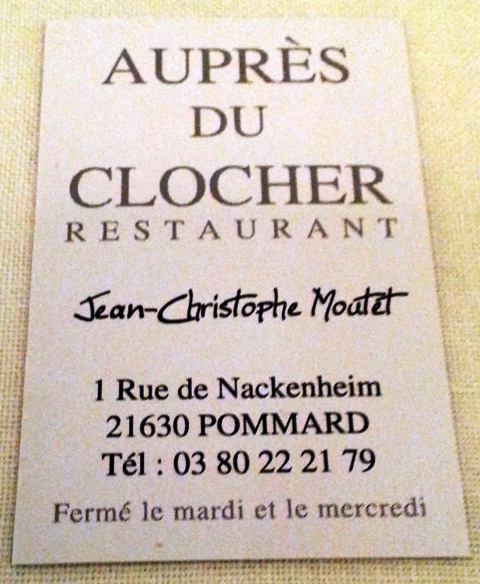 Mon étape à Meursault est au château de Cîteaux, demeure du 19ème siècle posée sur des caves plus vieilles d’au moins trois cents ans. Le propriétaire m’accueille et va religieusement déposer en cave les bouteilles que j’avais prévues. J’avais pris une chambre pour être sûr d’être à l’heure au rendez-vous de demain, qui tombe à l’eau. De dépit, je vais dîner au restaurant « Auprès du Clocher » à Pommard, tenu par Jean-Christophe Moutet, avec la ferme intention de prendre un grand vin.