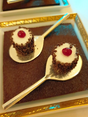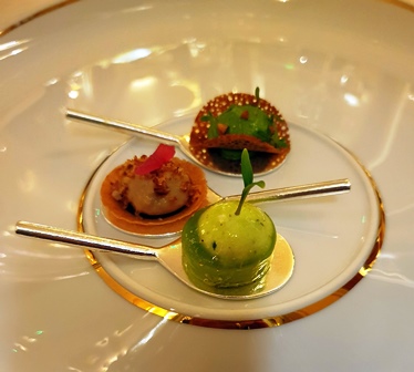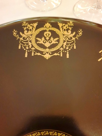 Lorsque l’on se met à table, on a devant soi une assiette marron sur laquelle sont imprimés des motifs en or assez chargés. Tout-à-coup, deux serveuses arrivent, prennent les deux assiettes devant nous, et par une pirouette les retournent. Nous avons alors une assiette toute blanche joliment dessinée qui sera prête à recevoir les amuse-bouches. C’est amusant.