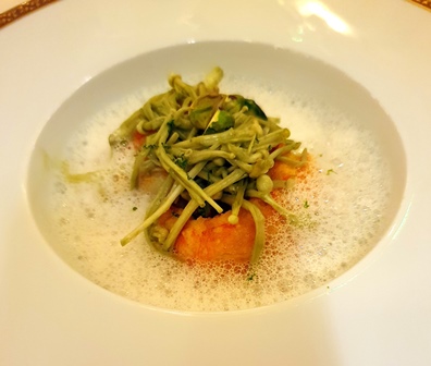 Le Ritz a pris de longues années pour faire sa rénovation et ça ne se voit pas dans ce que nous visitons. La salle à manger aux décors de stucs très chargés fait très Sissi Impératrice. Il ne manque que les crinolines. Au centre de la grande pièce le grand lustre surplombe un énorme bouquet aux couleurs d’automne qui ne va pas du tout avec le lustre. Les tables sont bien espacées ce qui est un luxe appréciable. Le personnel qui nous reçoit est souriant et tout au long du repas nous constaterons qu’ils sont décontractés et ouverts ce qui est agréable. Je revois avec plaisir Estelle Touzet chef de la sommellerie, qui a confié à Victor le service des vins de notre table, qui se révèle d’une très grande compétence.