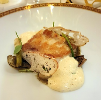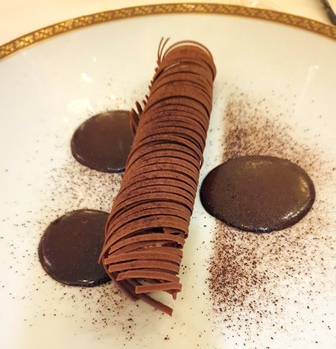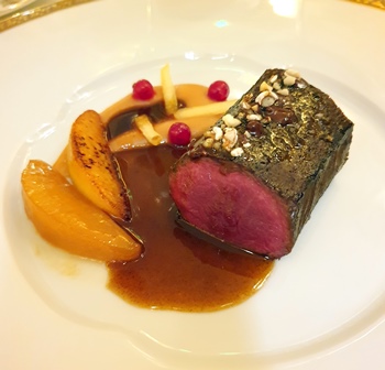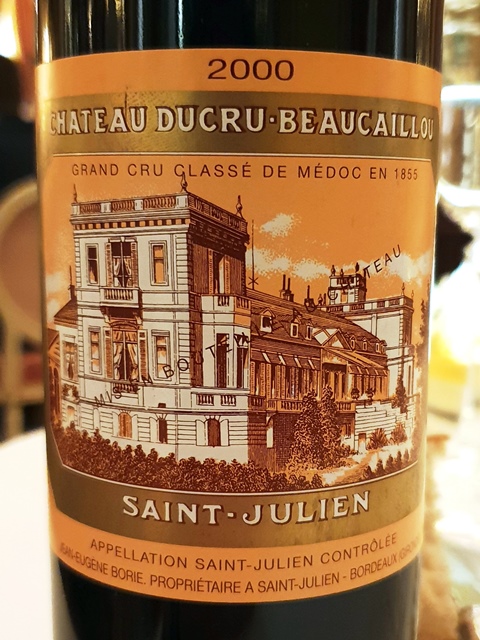 Le Champagne Laurent Perrier Cuvée Grand Siècle est d’une grande délicatesse, mise en valeur par un verre Riedel quasi idéal. Le champagne est raffiné et va accompagner quasiment tous les plats avec brio. J’ai toutefois commandé un demi-verre de Château Ducru-Beaucaillou 2000 servi à l’aide d’un Coravin, outil qui soutire du vin par une longue seringue, sans que l’on soit obligé d’extraire le bouchon. Ce Saint-Julien très lourd et très riche, extrêmement truffé est de grand plaisir et accompagne le chevreuil de façon parfaite.