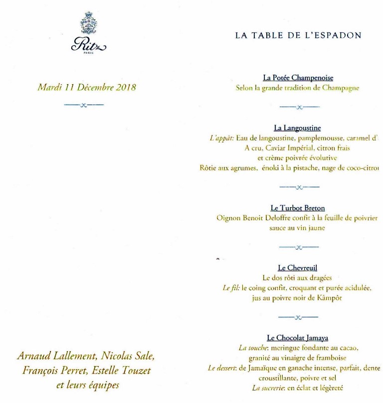 Le menu conçu pour les deux chefs plus le pâtissier du lieu est : la potée champenoise, selon la grande tradition de Champagne (Arnaud Lallement) / la langoustine en trois services. L’appât : eau de langoustine, pamplemousse, caramel d’ail – à cru, caviar impérial, citron frais et crème poivrée évolutive – rôties aux agrumes, énoki à la pistache, nage de coco-citron vert (Nicolas Sale) / le turbot breton, oignon Benoit Deloffre confit à la feuille de poivrier, sauce au vin jaune (Arnaud Lallement) / le chevreuil, le dos rôti aux dragées, le fil : le coing confit, croquant et purée acidulée, jus au poivre noir de Kâmpôt (Nicolas Sale) / le chocolat Jamaya, la touche : meringue fondante au cacao, granité au vinaigre de framboise. Le dessert : de Jamaïque en ganache intense, parfait, dentelle croustillante, poivre et sel. La sucrerie : en éclat et légèreté (François Perret).