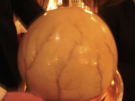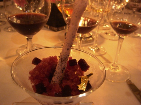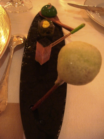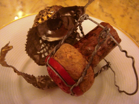 le bouchon du Cristal Roederer 1979 et sa capsule forment une sculpture à la Louise Bourgeois et ses araignées. Le jeu des amuse-bouche raffinés fait très "odyssée de l’espace" et ses petits hommes verts