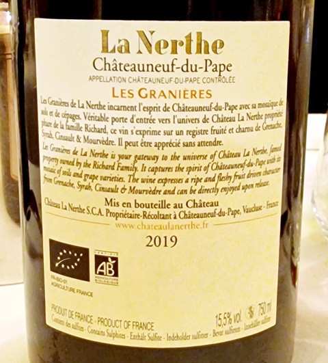 On me présente la bouteille et je vois : La Nerthe Châteauneuf-du-Pape Les Granières 2019. Ce n’est pas la première fois qu’une carte des vins porte le nom du cru prestigieux et que l’on sert le second vin. J’avais eu une confusion du même genre dans un autre restaurant où l’on proposait un Hermitage La Chapelle alors que le vin servi était un Chapelle de l’Hermitage qui est un second ou troisième vin.