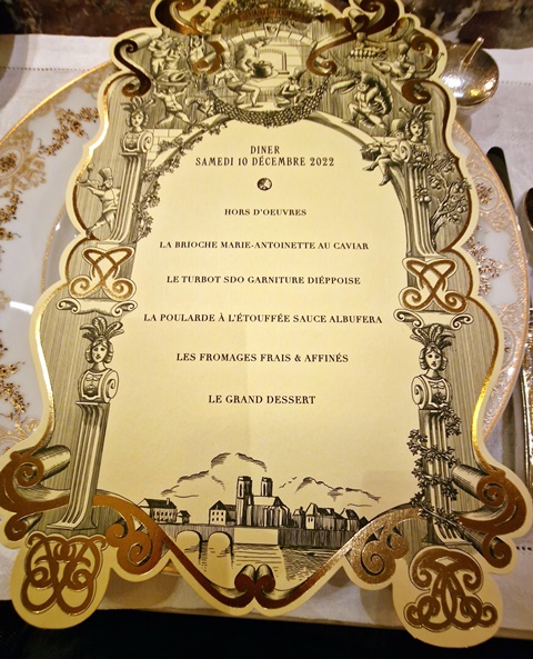 Le menu commun a été mis au point entre nous par des échanges de mails. Il est ainsi rédigé : hors d’œuvre / la brioche Marie-Antoinette au caviar / le turbot et sa garniture dieppoise / la poularde à l’étouffée sauce Albufera / les fromages frais et affinés / le grand dessert.