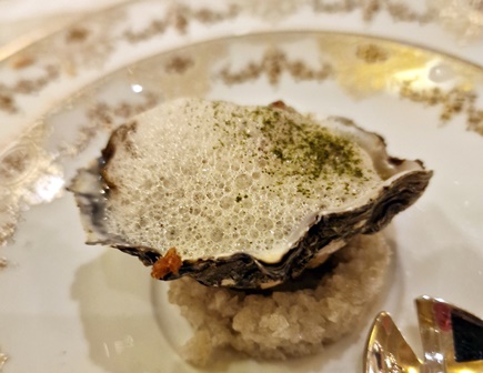 Nous avons commencé par un Champagne Billecart-Salmon magnum 2009. La tâche n’est pas facile pour ce champagne qui arrive après le Dom Pérignon, mais il prend sa place. Il s’ébroue avec les amuse-bouches et présente une belle acidité et se marie bien avec la délicieuse huître.