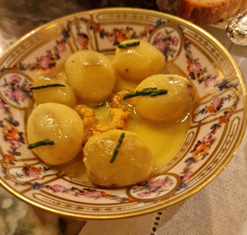 Pour la poularde j’aurais volontiers choisi un vin rouge mais Laurent a eu raison de m’orienter vers L’Hermitage Jean-Louis Chave blanc 2010. La couleur de ce vin est beaucoup plus foncée que celle du chablis et en bouche ce vin est d’une extrême puissance, chaleureux, expressif et racé. Son nez est percutant. C’est un très grand vin dans un état d’accomplissement parfait. La chair de la poularde est d’une tendreté rare et la sauce encore une fois fait le lien avec le vin. Les petites pommes de terre sont de vrais bonbons.