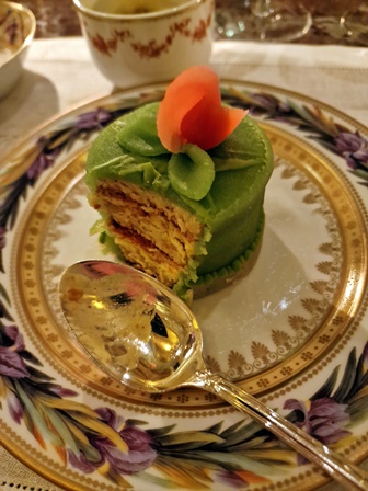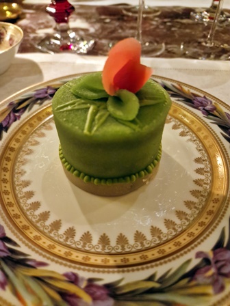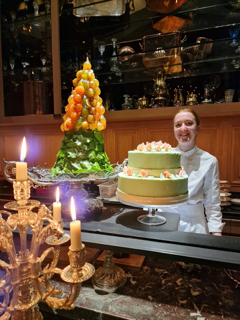 Une souriante pâtissière avait levé un store pour que l’on puisse voir, dans l’axe de notre grande table un sapin de Noël fait de fruits confits de toutes les couleurs. On nous sert le grand dessert qui offre une profusion de saveurs. J’avais déjà estimé être arrivé au-delà de mes limites lors du premier dîner. Je pense que le grand dessert va un peu trop loin même si l’intention est louable. Quand on est gourmand, on mange tout, mais ce n’est pas raisonnable.