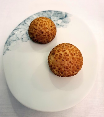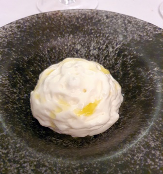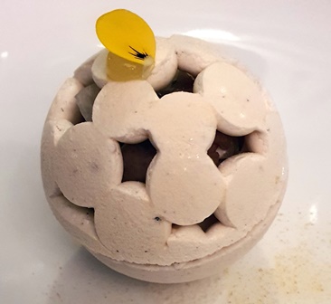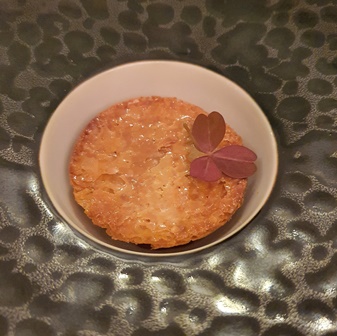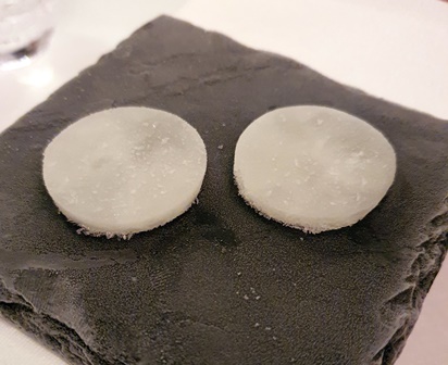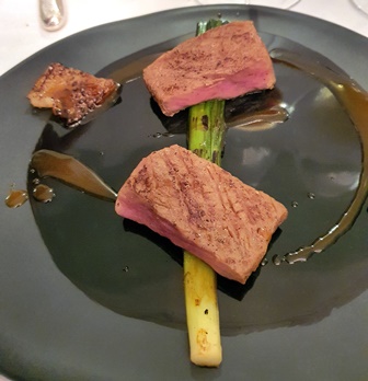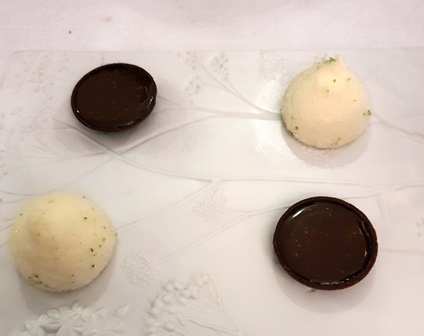 Le menu que nous avons choisi ne nous est pas communiqué. Nous en recevrons les intitulés en fin de soirée : granité au Shiso rouge / tartelette yaourt, sardine espagnole, oignon rouge / concombre au miso, gougère à la crème de parmesan / le jardin de légumes croquants, mousse de roquette, émulsion de citron, vinaigrette de tomates et crumble d’olives noires et amandes / gnocchis crème de parmesan, jambon Bellota, truffe blanche d’Alba / langoustine façon Bloody Mary, caviar Shrenki et quinoa croustillant / le bœuf Wagyu, poireaux grillés, condiment moutarde, raifort et cresson, en tartare, écume de tomate épicée, charbon végétal et caviar / le pigeon de Vendée au miso, figue rôtie / émulsion de brebis et chèvre, glace au cassis et miel d’acacia / vacherin façon Mont-Blanc, sorbet yuzu / tarte Tatin caramel / guimauve glacée piña colada, tartelette caramel et nougatine.