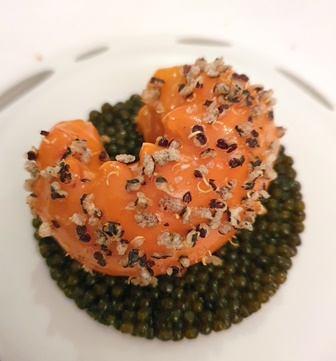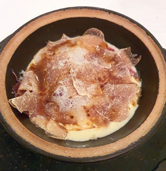 J’ai une grande admiration pour la cuisine du chef Kei et l’obtention d’une troisième étoile est pleinement justifiée, mais ce soir le style des plats m’a un peu dérouté, comme si le chef, au lieu de garder la pureté épurée des chefs japonais avait orienté sa cuisine sur l’opulence et les complexités. Le jardin de légumes, de jolie présentation et annoncé comme plat emblématique du chef, a une mâche déroutante car les morceaux de légumes, trop longs, sont difficiles à manger. Et la confusion des goûts nuit à la cohérence. La truffe blanche d’Alba coupée en trop fines lamelles, est presque éteinte malgré sa qualité. La langoustine, noyée dans une crème très forte, écrase le caviar qui devient muet. La langoustine seule est magnifique, le caviar seul est fort bon, mais la combinaison rend le caviar inexistant. De ce fait, si les délicieux amuse-bouches ont fait briller le champagne Selosse, il n’y a pas eu de vraies occasions pour la Version Originale de briller sur les plats suivants.