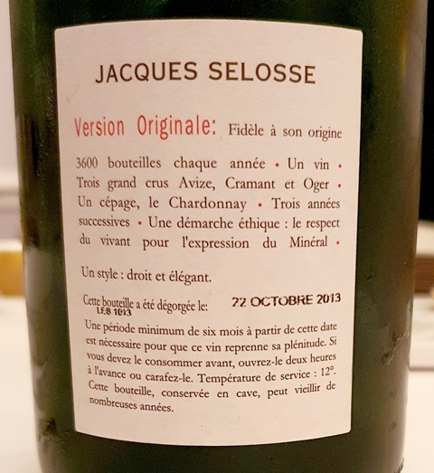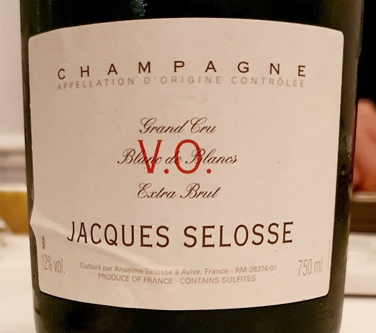 Pour l’apéritif, nous prenons un Champagne Version Originale Jacques Selosse dégorgé en octobre 2013, qui accompagnera aussi les premiers plats. Ce champagne un peu ambré a un nez très typé et intense. En bouche il est sans concession, et comme le parfum, intense, profond, de forte personnalité. C’est un champagne de gastronomie, noble et complexe dont j’aime le style.