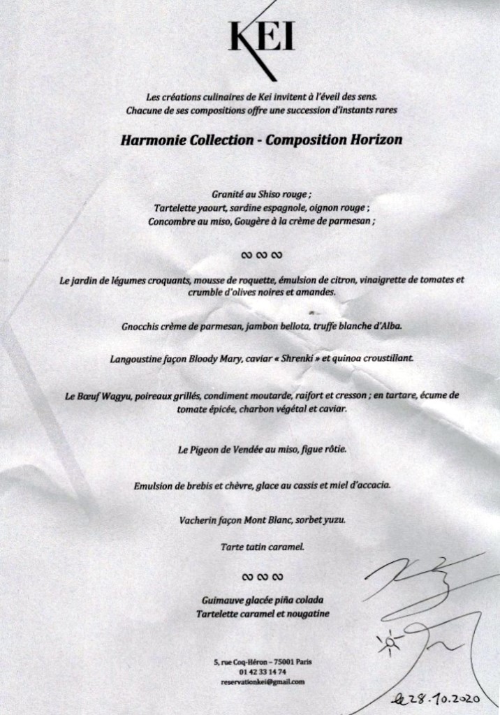 Un ami italien est à Paris. C’est un fidèle de mes dîners. Il a notamment participé à deux dîners au château de Saran et à un ou deux dîners au château d’Yquem. Il m’envoie un message proposant de déjeuner ou dîner ensemble dans des restaurants prestigieux. Je choisis de le rejoindre à dîner au restaurant Kei, le soir où le Président Macron va nous annoncer des mesures de confinement.