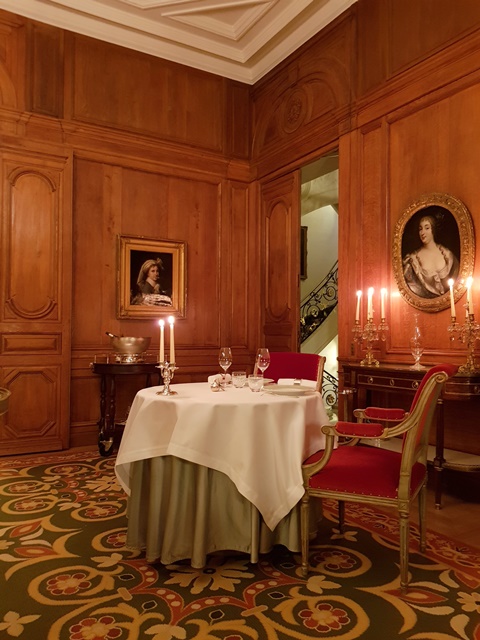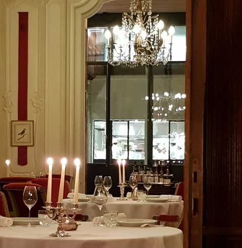 L’immeuble est beau. La salle à manger du premier étage est décorée comme celle d’une maison bourgeoise. Etant en avance je vais saluer en cuisine le chef Christophe Pelé qui me parle des beaux produits qu’il peut cuisiner ce soir et je commence à regarder la carte des vins présentée en deux livres. L’un concerne les vins du groupe Clarence Dillon et l’autre les vins du reste du monde. Le livre des vins du groupe me donne des nausées. Le Haut-Brion 1961 est proposé à plus de dix mille euros et le 1989 à plus de cinq mille euros. Dans ce restaurant, boire ce premier grand cru classé emblématique devrait être une joie. A de nombreuses tables on ne boit que les seconds vins voire les troisièmes vins. C’est dommage.