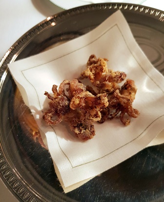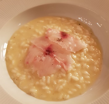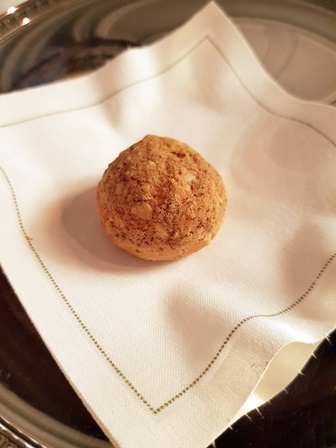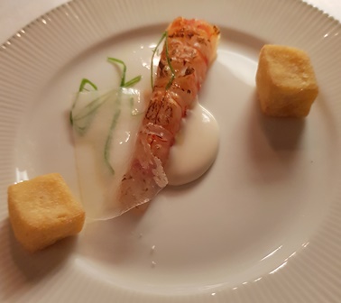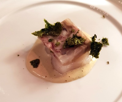 Le Champagne Bérêche Brut Réserve a été dégorgé il y a peu de mois aussi est-il un peu vert mais il suffit de la délicieuse palourde d’amuse-bouche pour le réveiller et montrer sa belle vivacité. Son dosage est parfait pour que soient équilibrées de belle façon sa vivacité et sa gourmandise. Des gougères et des petits chips de poulpe mettent bien en appétit.