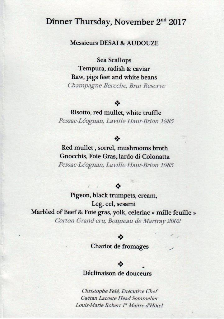 Le menu que nous avons composé avec l’excellent et professionnel maître d’hôtel Louis-Marie Robert est : Saint-Jacques en tempura, radis et caviar à cru, pied de cochon et coco de Paimpol / risotto, rouget et truffe blanche / rouget, oseille, bouillon, champignons, gnocchis, foie gras, crevettes et lard de Colonnata / pigeon, trompettes de la mort, crème crue, cuisse, anguille, sésame, marbré de bœuf et foie gras, jaune d’œuf, millefeuille de céleri / chariot de fromages / glace et sorbet.