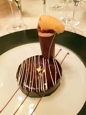 Malgré quatre plats, nous prenons du fromage dont un Comté de 48 mois de grande qualité et le maître d’hôtel truculent arrive à me faire commander un dessert au chocolat pour le Clape de fin.