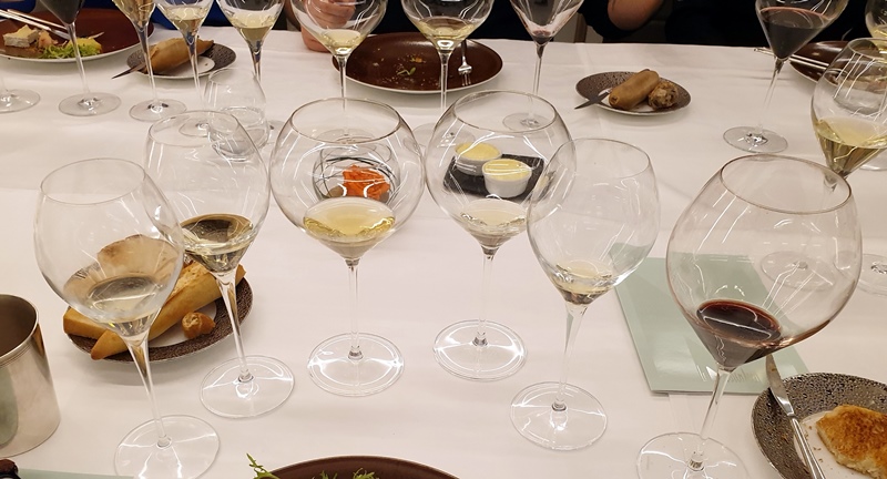 Le Champagne Legras & Haas magnum 2008 proposé pour l’apéritif en attendant quelques convives est servi un peu chaud. Il a beaucoup moins d’énergie que celui servi ce matin à la température idéale. Les verres du restaurant sont de beaux verres Lehmann mais ne sont pas en cristal comme ceux de la maison Legras & Haas, et l’on sent la différence de finesse entre les deux sensations. Quand le 2008 est confronté aux tuiles au parmesan, il reprend de la force et montre que cette année est prometteuse et doit encore attendre quelque temps avant de livrer ses richesses.