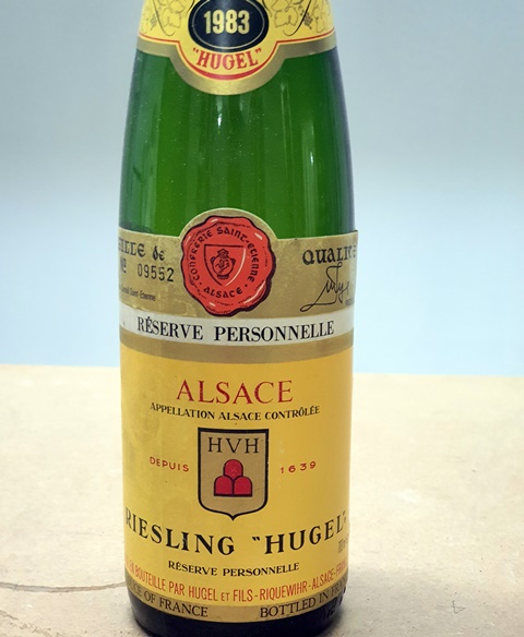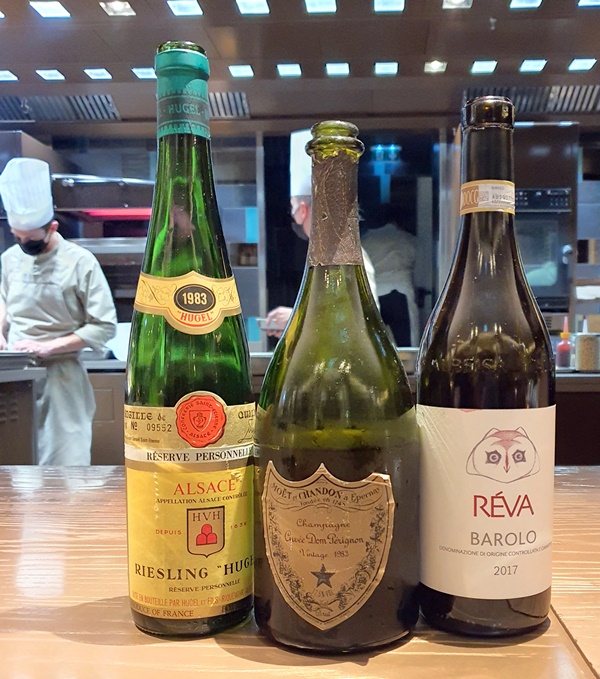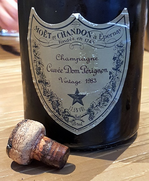 Peu avant 20 heures, j’arrive sur place et je montre au sommelier ce que j’ai apporté. N’ayant pas pris mes outils, le riesling 1983 est ouvert par le sommelier. Avec le tirebouchon limonadier classique il n’est pas étonnant que le bas du bouchon ne remonte pas et tombe dans le liquide. Le sommelier adroit a réussi à extraire le bas du bouchon. Aucune miette ne reste. Tant mieux.