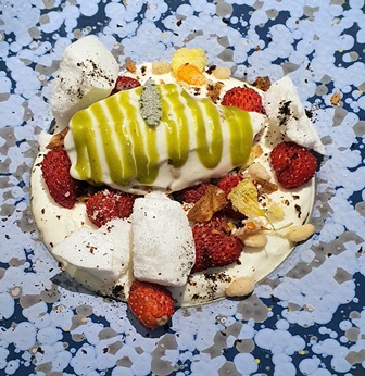 Il y a un menu à sept plats et un menu à cinq plats. Nous préférons être raisonnables et le menu est ainsi rédigé : moules de chez Morisseau, en soupe froide aux pépins de tomate, crème glacée / soufflé au fromage, à la vapeur, sauce composée au vin jaune, croquant de céleri et râpée de noix de muscade / rouget à la grande friture, à la diable, concassée d’huîtres de claire à l’huile d’estragon / pigeon du pays de Racan, poché au lait d’algue kombu grillée, tanin de betterave et sabayon à l’ail des ours / des fraises des bois, fraîches et mi- confites, glace à la mascarpone et parfum de tagette.