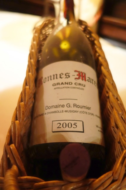 Mais il faut reconnaître que tout est bon, les produits sont bons, les saveurs sont belles. Seule l’exubérance est dalinienne. Venons-en au vin. Le nez est vif et plaisant. La bouche est active et racée. On sent qu’on est en présence d’un vin bien construit avec un fruit hyper présent et l’alcool présent aussi. Il faut dire que j’ai bu hier deux bourgognes, de 1966 et 1959. De ce fait, ces aspects de vins jeunes sont plus sensibles pour moi. Le vin est bon, même grand, mais je dois avouer que je suis resté sur ma faim. Le Bonnes Mares Domaine Georges Roumier 2005 est bien, presque parfait dans sa construction, mais « trop » bien. Il manque une petite étincelle qui fait qu’on l’aimerait. Il s’est montré très bon tout au long du repas, mais j’ai attendu le moment où il m’aurait ému. Je suis à peu près sûr que dix ans de plus lui donneraient le charme qu’il doit offrir, car il ne m’a montré aucun signe de défaut. Presque trop parfait serait ma conclusion.