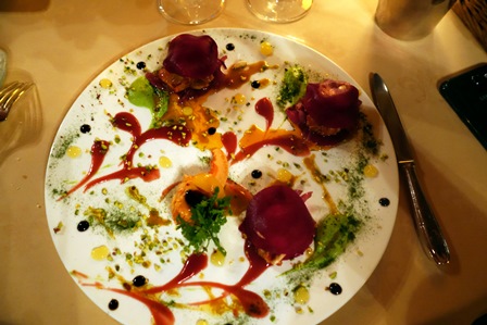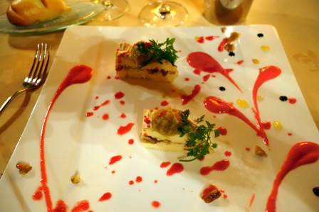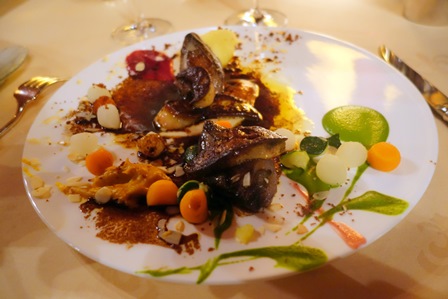 Je commence à regarder la carte des vins toujours aussi engageante et mes yeux se portent sur un Bonnes Mares Domaine Georges Roumier 2005. Bâtir un menu avec ce vin ne sera pas forcément facile et je choisis : Fraîcheur de homard en habit rouge, crémeux de Bufala à l’huile de pistache / suprême de pigeon rôti, foie gras rôti, caramel de betterave au vin rouge.