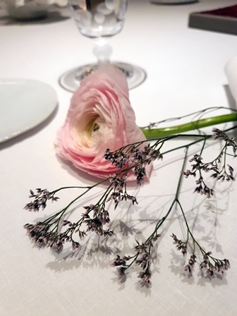 Etant avec ma femme en avance, j’ai le temps de consulter le livre de cave qui est imposant. Alors que le Cheval Blanc et Yquem sont des vins du même groupe que la Samaritaine, j’ai du mal à comprendre pourquoi les prix sont si dissuasifs. Il y a dans cette carte des prix dans toutes les directions, de l’inaccessible au tentant. J’ai pu trouver pour le repas des vins de haute qualité.